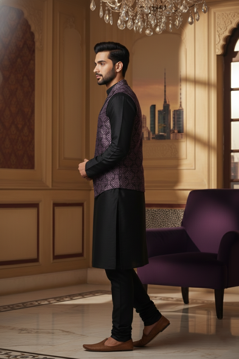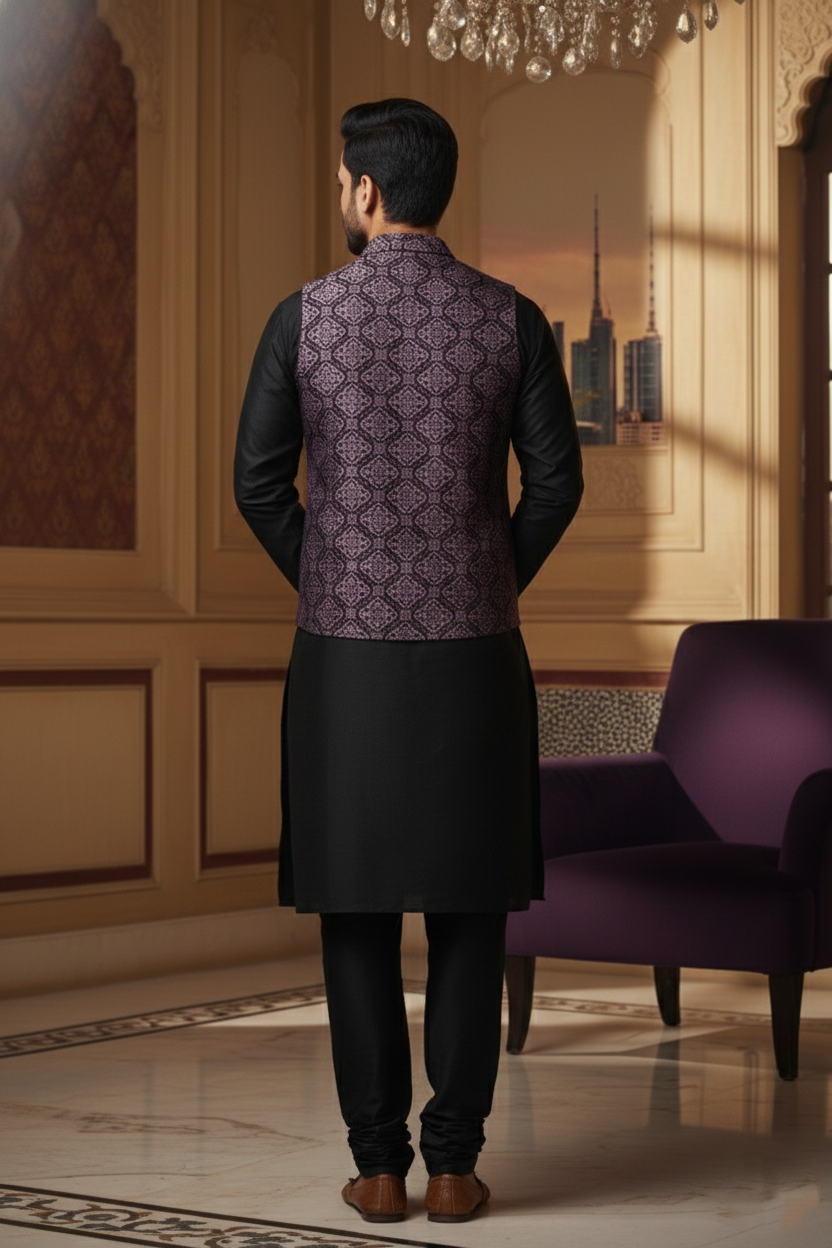 Upgrade your occasion wear with this elegant black jacquard silk waistcoat. Designed with a stylish notch lapel and rich woven texture, this vest delivers a premium, sophisticated look. Perfect for weddings, receptions, parties, and festive celebrations, it pairs effortlessly with kurtas or formal shirts.