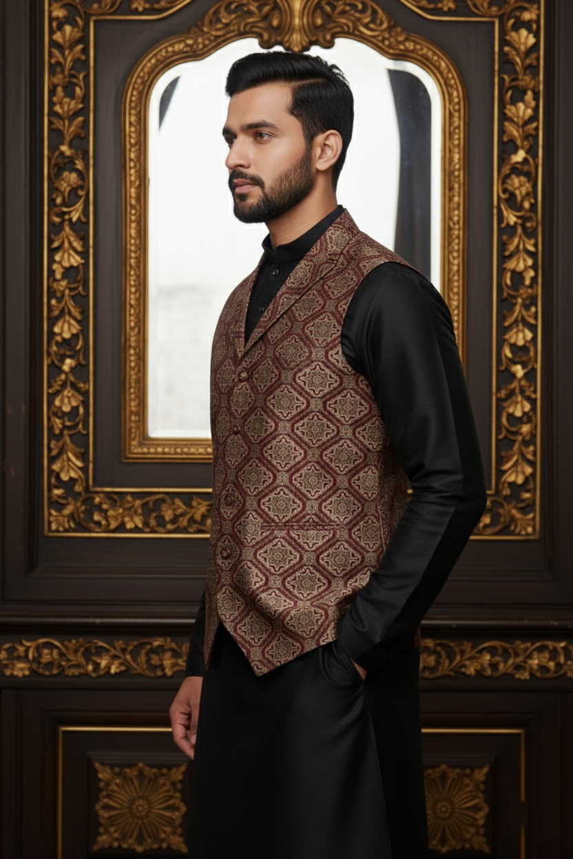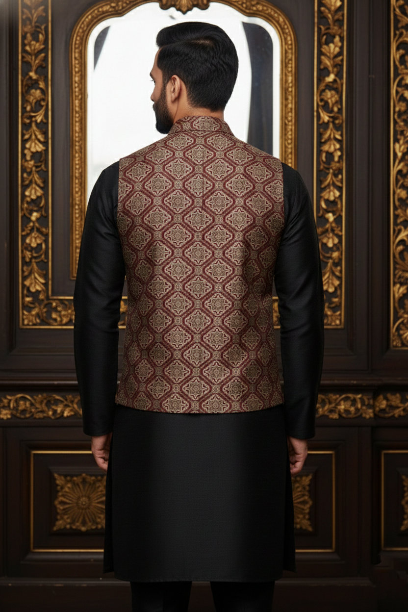 Add a stylish touch to your occasion wear with this light red waistcoat featuring elegant dark red line patterns. Designed with a tailored slim fit and classic lapel collar, this vest offers a refined yet festive look, perfect for weddings, celebrations, and party wear. Pairs effortlessly with kurtas or formal shirts.