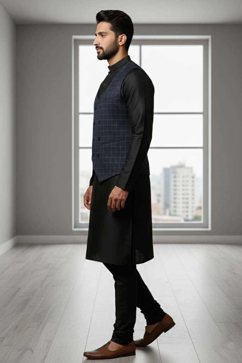 A sophisticated navy blue waistcoat featuring a classic windowpane check pattern. This double-breasted piece is designed with a modern U-shaped neckline and a slim-fit silhouette, making it a perfect choice for weddings, galas, and premium formal events.
