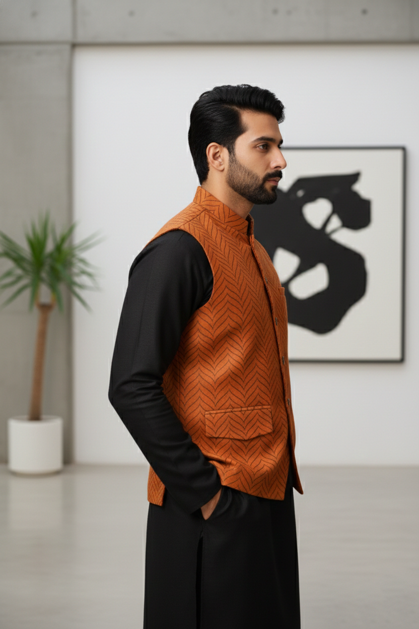 Elevate your ethnic style with this men’s rust orange Nehru jacket, featuring a sophisticated chevron woven pattern and a structured mandarin collar. Designed for weddings, festivals, receptions, and special celebrations, this sleeveless waistcoat delivers a perfect blend of tradition and modern elegance. Crafted from premium-quality fabric, it ensures superior comfort, durability, and a flattering tailored fit.